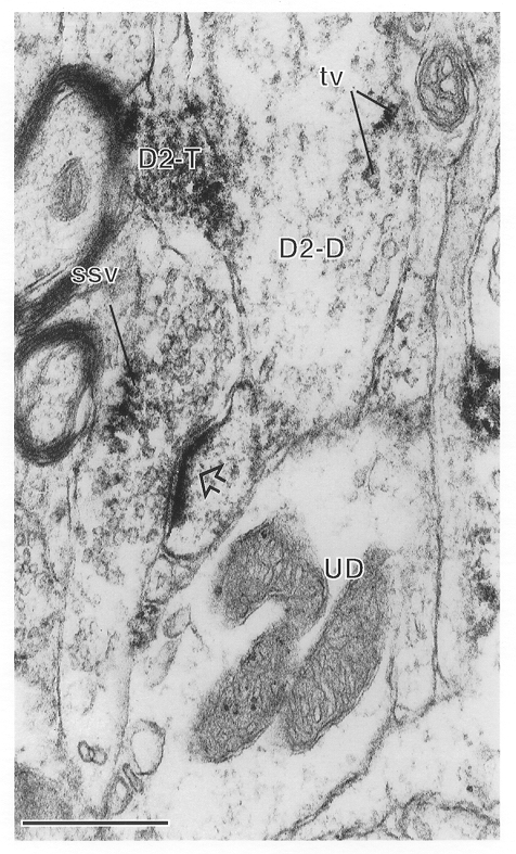 associated with tubulovesicles (tv). UD = unlabeled dendrite. Bar= 0.2 μm. |