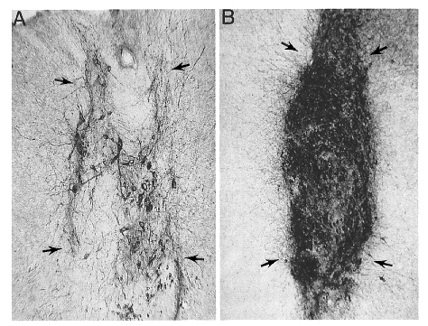 | Representative transplants (arrows) of embryonic DA neurons are seen in two adult African green monkeys at the same magnification. This comparison of grafted neurons collected from an optimally aged donor (B) versus those of an older donor (A) illustrates the dramatic increase in viability seen following grafting of the younger tissue. These illustrations are representative of grafts that contain approximately 500 (older donor) and 5000 (younger donor) tyrosine-hydroxylase-positive neurons as reflected by the density of perikarya. This enhanced survival undoubtedly relates to the immature stage of neuritic development at the earlier time, but may be attributed to other factors as well. |