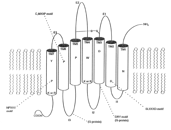 Schematic representation of a generalized G-protein coupled receptor structure. The labeled amino acids are highly conserved throughout the biogenic amine receptor family, including serotonin receptors. |