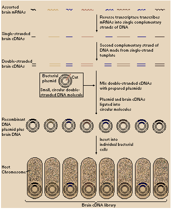 Making a brain cDNA library. A mixture of brain mRNAs are transcribed to make cDNAs. Each cDNA is ligated into an opened plasmid, a circular piece of bacterial DNA engineered so it will accept cDNA. The plasmid is also engineered to contain regulatory elements so that the cDNA will be transcribed in appropriate cells (bacterial or human as required). The closed plasmids, each containing a cDNA, are then inserted into bacteria. When the bacteria grow and divide, they not only replicate their own DNA but also make copies of the plasmid with the cDNA. (From ref. 2) |