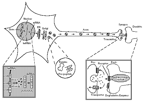 Diagram illustrating the biosynthesis and transport of neurotransmitters, their synthesizing enzymes, and neuropeptides, as well as neurotransmitter release.