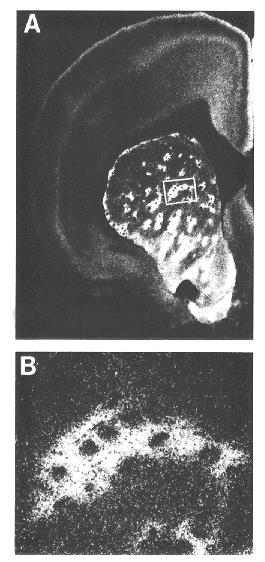 Dark-field photomicrograph illustrating distribution of mu opioid receptor binding sites in a coronal hemisection of rat forebrain labeled by [3H]-DAGO. Note the patchy appearance of binding within the striatum. B: Boxed area in A is shown at higher magnification. (Courtesy of Dr. Alfred Mansour.) |
