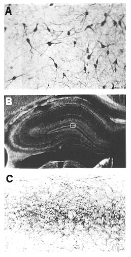 Immunocytochemical detection of choline acetyltransferase, the acetylcholine-synthesizing enzyme, using a protocol outlined in Fig. 5. Cholinergic cell bodies and dendrites located within the medial septal nucleus are seen in A. These neurons are part of the origin of the cholinergic septohippocampal pathway. The low-magnification darkfield photomicrograph in B illustrates the distribution pattern of cholinergic fibers and terminals within the dentate gyrus. The boxed area in B is seen in C under brightfield illumination. (Courtesy of Dr. László Záborszky.) |