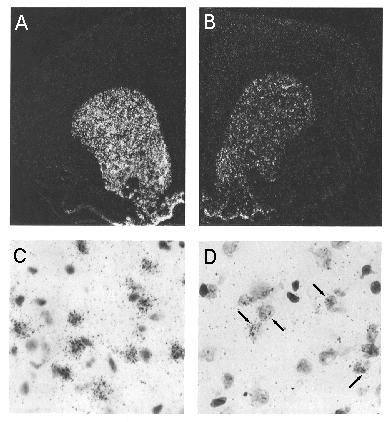 Dark-field photomicrographs in A and B illustrate distribution pattern of neurons expressing mRNA transcripts encoding the D2 dopamine receptor in the rat forebrain as revealed by in situ hybridization. The riboprobe used in the experiment shown in A was directed against an exonic portion of the D2 mRNA, whereas the probe applied in the experiment in B was specific for an intronic segment of the D2 hnRNA. Cellular labeling from the two cases is seen at higher magnification in the bright-field photomicrographs in C and D, which were from sections that were dipped in emulsion and Nissl-counterstained. Note the cytoplasmic distribution of grains from the experiment involving the exonic probe C, in contrast to the largely nuclear distribution of grains following application of the intronic probe D. (Courtesy of Dr. Charles A. Fox and Dr. Alfred Mansour.) |