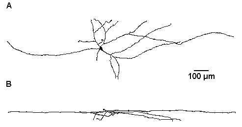 | Computer reconstruction of a substantia nigra DA neuron stained by Lucifer yellow. A: Examined in a frontal plane, the DA neuron dendrites are observed to extend for hundreds of microns in the dorsal/ventral plane (top/bottom of figure) and in the medial/lateral plane (left/right of figure). B: However, examined from a dorsal viewpoint, the anterior/posterior extent of the neuron (top/bottom of figure) is highly compressed. (Pucak and Grace, unpublished observations.) |