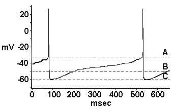 DA neurons recorded intracellularly in vivo and in vitro exhibit characteristic pacemaker-like slow depolarizations and high spike thresholds. In this recording from a spontaneously discharging DA neuron recorded in vitro from a rat midbrain slice, a slow membrane depolarizing conductance depolarizes this neuron from its resting potential (B) to the atypically high membrane potential threshold for spike generation that is characteristic for these neurons, which in this case is -33 mV (A). The action potential is followed by a calcium-dependent afterhyperpolarization (C), which then decays prior to the initiation of a subsequent slow depolarization. (From ref. 29, with permission.) |