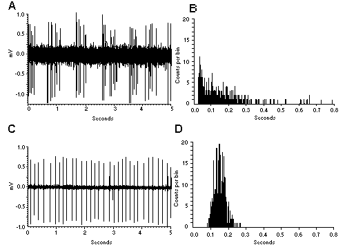 Rapidly firing DA neurons typically exhibit burst firing activity. A: In this DA neuron recorded in vivo in the substantia nigra of a rat, the spike activity is showing the characteristic pattern of burst firing in DA neurons: bursts of 3–10 spikes with comparatively brief interspike intervals (e.g., 80–160 msec) separated by extended periods of post-burst inactivity. The DA neuron in this example is discharging at 7.2 Hz. B: Plotting the spike discharge pattern in the form of an interspike interval histogram reveals the multimodal form of this activity. The initial peak at 40 to 60-msec intervals represents the interspike intervals within the burst events, whereas the long intervals illustrate the intervals between the termination of one burst and the onset of the subsequent event. C: In rats in which an electrolytic lesion of the subthalamic nucleus had been performed, DA cells located in the lateral portions of the substantia nigra often exhibited pacemaker-like discharge patterns. This DA cell is discharging at a rate (i.e., 7.0 Hz) comparable to that observed in A. D: As revealed in the interspike interval histogram for this neuron, the intervals between spikes in this neuron show a much narrower distribution. (From ref. 65, with permission.) |