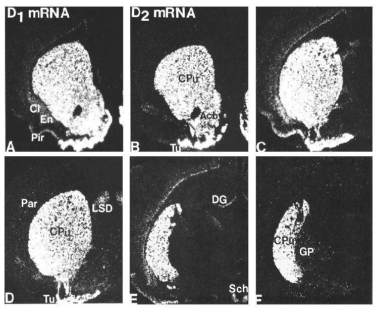 | Dark-field autoradiograms comparing the distributions of D1 (A, C, E) and D2 (B, D, F) receptor mRNAs in the rostral forebrain of the rat. D1 and D2 receptor mRNA expression is high in the caudate-putamen (CPu), nucleus accumbens (Acb), and olfactory tubercle (Tu). D1 expressing cells are extensively distributed in neo- and palleocortical areas with particularly high levels in the piriform cortex (Pir). Other cells expressing D1 receptor mRNA are localized in the dentate gyrus (DG), claustrum (Cl), endopiriform nucleus (En), and the suprachiasmatic nucleus of the hypothalamus (Sch). Cells expressing D2 receptor mRNA demonstrate a different distribution, with cells localized in the lateral dorsal septum (LSD), in the globus pallidus (GP), and in scattered cells of the parietal (Par) and frontal cortex. |