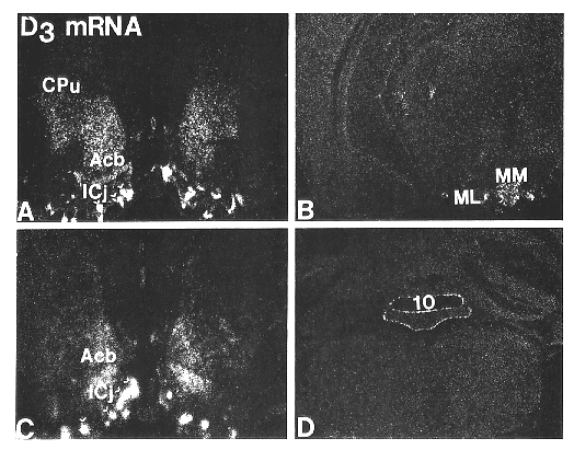 | Dark-field autoradiograms showing the distribution of D3 receptor mRNA at two levels of the nucleus accumbens (A = rostral, C = caudal), caudal hypothalamus (B), and cerebellum (D). Cells expressing D3 receptor mRNA are localized in the islands of Calleja (ICj), nucleus accumbens (Acb), medial caudate-putamen (CPu), medial (MM) and mediolateral (ML) mammillary nuclei of the hypothalamus, and lobule 10 of the cerebellum (10). |