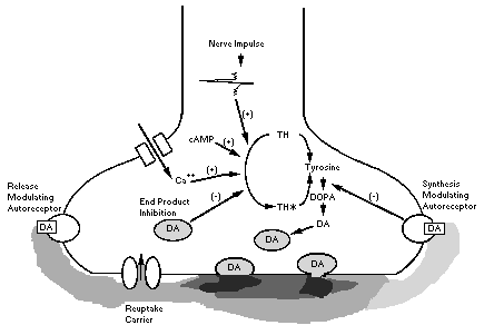 | Schematic model of a prototypic dopaminergic nerve terminal illustrating the life cycle of dopamine and depicting mechanisms which modulate dopamine release and synthesis. Invasion of the terminal by a nerve impulse results in the Ca2+-dependent release of dopamine. This release process is attenuated by release of modulating autoreceptors. Increased impulse flow also stimulates tyrosine hydroxylation. This appears to involve the phosphorylation of tyrosine hydroxylase (TH), resulting in the conversion to an activated form with greater affinity for tetrahydrobiopterin cofactor. The rate of tyrosine hydroxylation can be attenuated by (a) activation of synthesis-modulating autoreceptors, which may function by reversing the kinetic activation of TH, and (b) end-product inhibition by intraneuronal dopamine which competes with cofactor for a binding site on TH. Release- and synthesis-modulating autoreceptors may represent distinct sites. Alternatively, one site may regulate both functions through distinct transduction mechanisms. The dopamine transporter is a unique component of the dopamine terminal, which serves an important physiological role in the inactivation and recycling of dopamine release into the synaptic cleft. |
