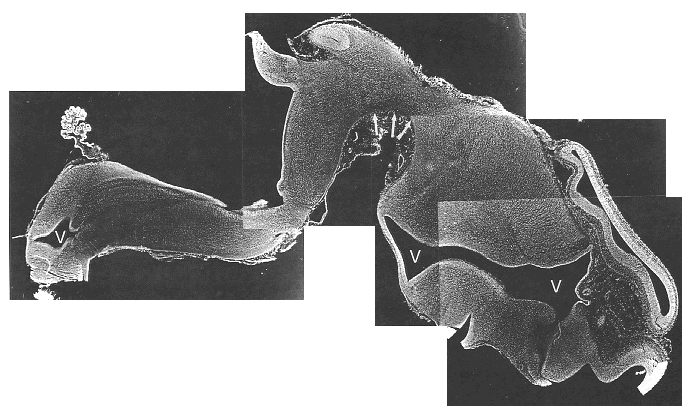 This dark-field photomontage of an E 40–41 African green monkey shows the full extent of brain development from the forebrain (right) to the hindbrain (left). The ventricular system (V) forms a prominent cavity which can serve as a useful neuroanatomical landmark. The mesencephalic flexure (arrows) demarcates the developing ventral mesencephalon. This region is illustrated in greater detail in Fig. 2. |