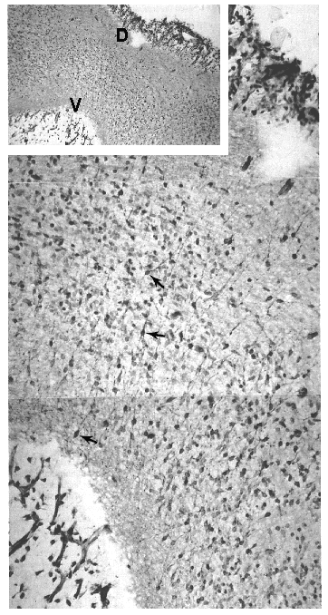 The low-power insert illustrates the region of the mesencephalic flexure through its full dorsal (D) to ventral (V) extent. This section is adjacent to the midline; therefore the aqueduct of the mesencephalon is not visible. Nevertheless, newly born DA neuroblasts migrate from the germinal epithelium ventrally, and in so doing they provide the appearance seen in the high-power photomontage of small, bipolar neurons with elongated neurites that extend in a dorsoventral plane. The migrating neurons (arrows) are stained for tyrosine hydroxylase and demonstrate the early onset of transmitter enzyme in these neurons as depicted at E 40–41. |