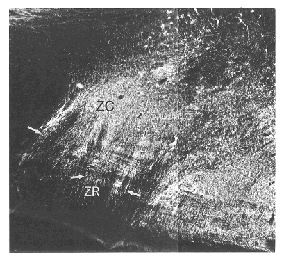 This higher-power view of the ventral mesencephalon at age E 90 illustrates the dense packing of DA neurons as well as the highly developed dendritic bundles (arrows) that course from the substantia nigra zona compacta (ZC) into the zona reticulata (ZR). Ascending axons en route to the striatum are seen in the upper left corner of this photograph. |