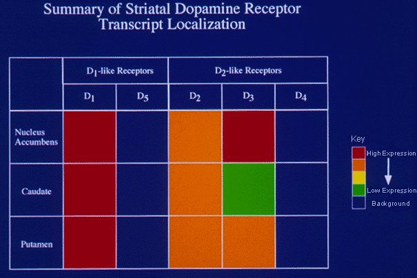 Summary of dopamine receptor transcripts in human striatum. Representative anatomical images of dopamine receptor mRNA localization are shown in