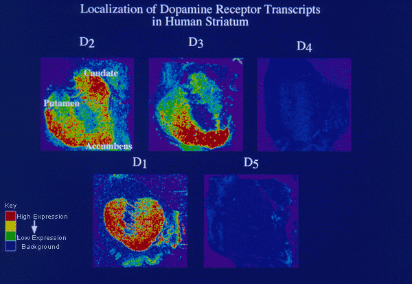 Representative false-color images of dopamine receptor mRNA localization in the human striatum. An associated summary diagram is presented in