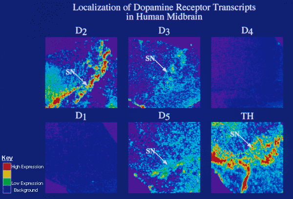 Representative false-color images of dopamine receptor mRNA localization in the human midbrain at the level of the substantia nigra (SN). Also shown is a representative section labeled for tyrosine hydroxylase (TH) mRNA, reflecting dopamine synthesis. The dopamine receptor transcripts encode receptors that function as autoreceptors. An associated summary diagram for the human midbrain is presented in Figure 8. |