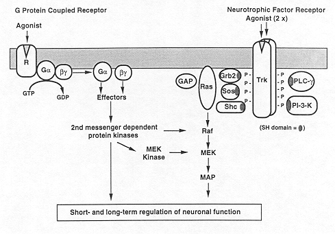 Schematic illustration of the mechanisms by which G-protein coupled receptors and receptor-associated protein tyrosine kinases function in the brain. G-protein coupled receptors and receptor-associated protein tyrosine kinases employ distinct mechanisms for activation of intracellular signal transduction pathways. Activation of G-protein coupled receptors (R) leads to association of the receptor with a heterotrimeric G-protein comprised of single a, b, and g subunits. This leads to the binding of GTP to the a subunit and the displacement of GDP from the subunit. GTP binding induces the generation of free a subunit by causing the dissociation of the a subunit from its bg subunits and the receptor. Free a subunit bound to GTP, and free ba subunits, are functionally active and directly regulate a number of effector proteins, which, depending on the type of a and ba subunits and cell involved, can include ion channels, adenylyl cyclase, phospholipase C, and phosphodiesterases. GTPase activity intrinsic to the a subunit hydrolyzes GTP to GDP. This leads to the reassociation of the a and bg subunits, which, along with the dissociation of ligand from the receptor, leads to restoration of the basal state. Nerve growth factor receptors (i.e., Trks), as well as other growth factor receptors, stimulate protein tyrosine kinase activity intrinsic to the receptor. Binding of two molecules and dimerization of Trk receptors is necessary for receptor activation. This leads to phosphorylation of the receptor itself and adaptor proteins with Src homology (SH) domains, such as Shc. The SH proteins, or phosphorylated receptor in some cases, then associates with Grb2. Grb2 then complexes with Sos (and related Ras effector proteins) via SH domains to promote GTP binding to Ras. The function of Ras is also negatively regulated by GAP (GTPase activating protein), which stimulates Ras GTPase activity and the hydrolysis of GTP to GDP. Ras, bound to GTP, is functionally active and directly stimulates Raf by an unknown mechanism. Raf, a protein serine/threonine kinase, phosphorylates and activates MEK (Mitogen and Extracellular-regulated Kinase), which then activates MAP kinase (Microtubule Associated Protein kinase; also referred to as ERK, Extracellular signal-Regulated Kinase) by phosphorylating it on threonine and tyrosine residues. Raf and possibly other MEK kinases can also be activated by second messenger-dependent protein kinases. This provides a pathway by which G-protein coupled receptors can influence this major growth factor-Ras cascade. |
