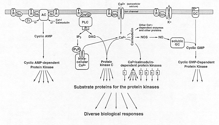 These second messengers, in turn, activate specific types of protein kinases. Brain contains one major type of cAMP-dependent protein kinase and of cGMP-dependent protein kinase, although subtypes of these enzymes are differentially expressed throughout the brain. These enzymes phosphorylate a specific array of substrate proteins, which can be considered third messengers. cAMP-dependent protein kinase has a broad substrate specificity, that is, it phosphorylates many substrate proteins and mediates most of the numerous second messenger actions of cAMP in the nervous system. The substrate specificity of cGMP-dependent protein kinase appears to be less broad, although by analogy with the cAMP system it is likely that it mediates many of the second messenger functions of cGMP. Brain contains two major classes of Ca2+-dependent protein kinase. One is activated by Ca2+ and calmodulin and is referred to as Ca2+/calmodulin-dependent protein kinase. Brain contains at least six distinct types of this enzyme: 1-4) Ca2+/calmodulin-dependent protein kinases I, II (several subtypes of this enzyme are known), III, and IV; 5) phosphorylase kinase; and 6) myosin light chain kinase. The other major class is activated by Ca2+ in conjunction with DAG and various phospholipids and is referred to as Ca2+/DAG-dependent protein kinase or protein kinase C; there are at least 7 closely-related variants of this enzyme present in the brain. Protein kinase C and Ca2+/calmodulin-dependent protein kinases II and perhaps I and IV have broad substrate specificities (as indicated by the multiple arrows in the figure) and each probably mediates many of the numerous second messenger actions of Ca2+ in the nervous system. [The figure also illustrates that some of the second messenger actions of Ca2+ in brain are mediated through proteins other than protein kinases.] Not shown in the Figure is the fact that some protein phosphatases are also subject to regulation by second messengers. For example, protein phosphatase 2B, or calcineurin, is activated upon binding Ca2+/calmodulin. Phosphorylation of substrate proteins by these various second messenger-dependent protein kinases alters their physiological activity in such a way as to lead to the biological responses of the extracellular messengers either directly or indirectly through intervening fourth, fifth, sixth, etc. messengers. Modified from Hyman and Nestler, 1993. |