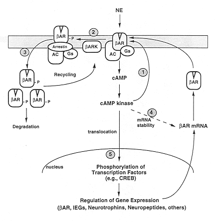 Schematic illustration of multiple mechanisms underlying regulation of the bAR. One of the best characterized actions of bAR activation is regulation of the receptor itself, which involves several points controlling receptor function and expression. 1) bAR stimulation of the cAMP system results in phosphorylation of the receptor by cAMP-dependent protein kinase, which leads to uncoupling of the receptor from Gs. The activated protein kinase would also phosphorylate many other proteins, not shown in the Figure, which would then mediate many of the actions of bAR activation. 2) Prolonged activation of the receptor leads to phosphorylation by another kinase, bAR kinase (bARK), which only phosphorylates the agonist-activated form of the receptor. This results in binding of the receptor to b-arrestin, which competes with Gs and thereby inhibits bAR-stimulation of adenylyl cyclase (AC). 3) Loss of bARs from the membrane occurs when receptors are internalized and sequestered into intracellular vesicles. This pool of receptors is then available for either recycling back to the membrane or degradation. Such sequestration, internalization, degradation, and membrane re-insertion may be mediated via receptor phosphorylation and dephosphorylation involving the cAMP and/or bARK pathways. Another mechanism by which receptor activation leads to down regulation of the bAR is via regulation of receptor mRNA levels, which may occur by two primary mechanisms. 4) The level of receptor mRNA is regulated by the stability or half-life of the mRNA. Although the mechanisms responsible for regulation of mRNA stability have not been identified, they may also involve cAMP-dependent protein kinase. 5) The level of receptor mRNA is also regulated via changes in bAR gene transcription. This effect is mediated by the cAMP pathway and appears to involve the translocation of cAMP-dependent protein kinase catalytic subunit into the nucleus and the phosphorylation of constitutively expressed transcription factors (e.g., CREB). It might also depend upon the subsequent induction of other transcription factors [e.g., immediate early gene (IEG) products such as c-Fos]. In addition to regulation of receptor gene transcription, such regulation of transcription factors would mediate the effects of bAR activation on the expression of many other genes, for example, those for G-proteins, cAMP-dependent protein kinase, neurotrophins, and neuropeptides. This, in turn, would mediate many of the more long-term effects of bAR activation on brain function. |