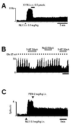 | A: Intracerebroventricular injection of the excitatory amino acid antagonist kynurenate (KYN) (0.5 mmol in 5 ml) strongly attenuated the withdrawal hyperactivity of LC neurons precipitated by intravenous naloxone (NLX: 0.1 mg/kg). (From ref. 3.) B: Computer-generated integrated activity–time histograms, revealing interactive effects of 5-HT and Glu on LC discharge. Pulses of Glu (applied at solid bars) activate a typical LC neuron. Co-iontophoresis of 5-HT (applied at open bars), but not of saline (applied at stippled bar), attenuates Glu response but has little effect on basal discharge. (From ref. 7.) C: Effects of intravenous administration of the indirect 5-HT agonist d-fenfluramine (FEN) on the activity of LC neurons during opiate withdrawal. Ratemeter record illustrating the attenuation of withdrawal-induced activation of LC neurons by d-fenfluramine. d-Fenfluoramine (2 mg/kg i.v.) strongly but incompletely reversed the activation of this typical LC neuron following morphine withdrawal precipitated by i.v. naloxone (0.1 mg/kg). (From ref. 4.) |