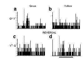 A reversal procedure in a visual discrimination task in monkeys reveals responses for LC neurons specific to meaningful stimuli. Target stimuli occur on 10% of trials, and non-target stimuli occur on 90%; stimuli are presented at vertical dashed lines in each histogram. The animal receives a drop of juice when it responds after a target stimulus. a and b: Post-stimulus-time histograms (PSTHs) for response of an LC neuron to green (target), but not to yellow (non-target) stimuli. c and d: Similar PSTHs for the same LC neuron after reversal training such that target stimuli are now yellow and non-target stimuli green. Note that green stimuli (c) no longer elicit responses, whereas yellow stimuli (d) now elicit a small response. Thus, the response is selectively elicited by meaningful stimuli. Calibration bar represents 1 sec. (From ref. 8.) |