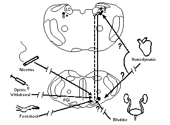 Schematic illustrating possible pathways involved in LC activation by different stimuli. The top coronal section is at the level of LC. The bottom coronal section is at the level of the PGi. Substantial evidence suggests that LC activation produced by nicotine, opiate withdrawal, and footshock is mediated by excitatory amino acid afferents (open circle, dotted line) from PGi. Although LC activation by bladder distention requires excitatory amino acid afferents to the LC, the source of these afferents have not been determined (indicated by "?"). LC activation by hemodynamic stress requires CRF input to the LC (solid circles, solid line), although the source of these afferents has not been established (indicated by "?"). Potential sources of CRF input to LC that may mediate this activation include the PGi, pericoerulear CRF neurons such as Barrington's nucleus (B), or the dorsal cap of the paraventricular nucleus of the hypothalamus (not shown). Breaks in the lines leading from the stimulus to the brainstem indicate that the circuitry underlying the activation of LC afferents by the different stimuli is unknown. |