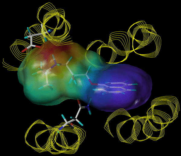 An extracellular view of propranolol bound to Site 2 of a model of the T355N mutant 5-HT1Db receptor. A map of the electrostatic potential of propranolol plotted at the van der Waals surface indicates relatively electropositive (red) and electronegative (blue) regions of the ligand. |