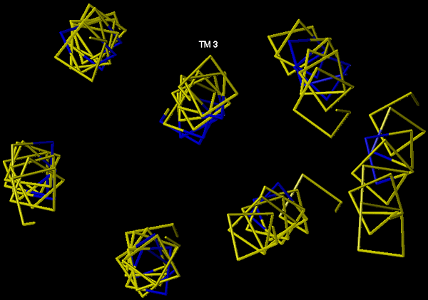 The spatial orientation of highly conserved residues (blue) in a rhodopsin-based 5-HT2A receptor model. The model is shown as an extracellular view of a trace of a-carbons only. The helices are ordered in a counter-clockwise fashion. |