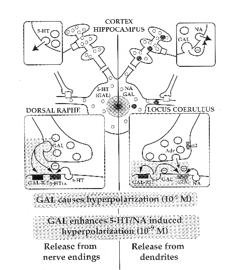 Schematic illustration of effects of galanin on a serotoninergic dorsal raphe neuron (left panel) and a noradrenergic locus coeruleus neuron (right panel). Under normal circumstances the 5-HT neuron expresses low levels of galanin and the peptide can not be detected in cell bodies or forebrain nerve terminals. In contrast, the noradrenergic neuron has a robust galanin synthesis, and galanin can be detected in cell bodies as well as cortical and hippocampal nerve terminals. The 5-HT neurons are innervated by non-serotonergic galanin-containing boutons of unknown origin. There are comparatively few galanin nerve endings surrounding and synapsing on locus coeruleus neurons. Therefore, under normal circumstances galanin acting on 5-HT neurons may mainly originate from synaptic nerve endings in the dorsal raphe, but from dendrites and soma in the locus coeruleus. Especially under conditions when galanin synthesis is upregulated in 5-HT neurons, galanin may also in this region be released from dendrites and soma. The effect of galanin on 5-HT and noradrenaline neurons is similar, causing hyperpolarization via a direct action on a galanin receptor of not yet defined type. Somewhat higher concentrations are needed in the dorsal raphe as compared to locus coeruleus. In addition, galanin at low concentrations (10-9M) enhances the inhibitory effect of 5-HT on the 5-HT1A receptor on the 5-HT neurons and of the a2A receptor on the noradrenaline neurons. These effects, obtained at low peptide concentrations, may in fact be in the physiological range. From Ref. 61. |