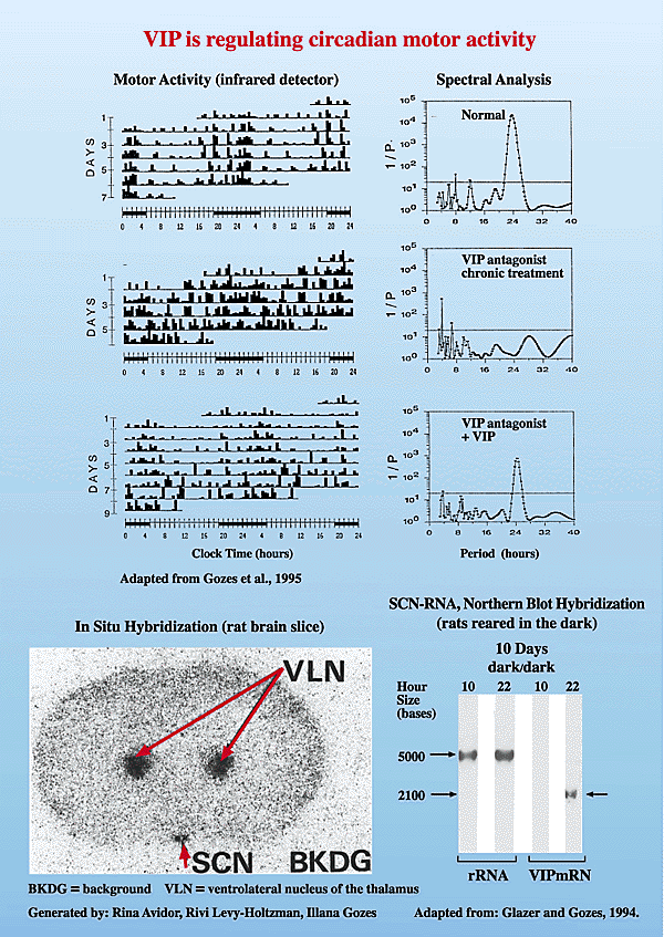 Figure 3. VIP is a regulator of circadian motor activity (58). The top panel compares motor activity and spectral analysis from rats treated with saline, a VIP antagonist or antagonist plus VIP. The VIP antagonist (neurotensin6-11 -VIP7-28) disrupted the diurnal pattern of locomotor activity. Co-treatment with VIP restored normal locomotor rhythmicity. The bottom left panel shows an in situ hybridization for VIP mRNA (R. Avidor, R. Levy-Holtman, I. Gozes). The bottom right panel compares the effect of dark rearing on ribosomal and VIP mRNA in the suprachiasmatic nucleus (48). |
