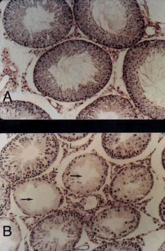 Figure 11. Section through the testis of a rat treated with saline (A) or with the LHRH agonist [D-Ala6]-LHRH-EA (B) (100 mg, twice weekly for 4 weeks). Most tubules are representing degenerative changes. In same tubules ('), all germinal and sertoli cells have completely disappeared. Leydig cells (L) have a normal appearance. (From ref. 133.). |