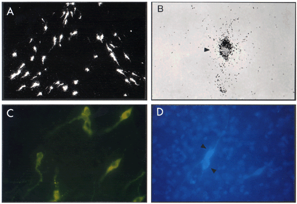 Figure 2B. Luteinizing hormone-releasing hormone (LHRH) neuronal system in the rat. B) A single neuron expressing the mRNA encoding LHRH and immunopositive for the nuclear protein Fos (immediate-early gene) in the MPOA of a female rat sacrificed in the afternoon of proestrus. |
