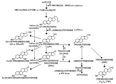 | Neurosteroids are defined as steroid produced in the brain from cholesterol. Some products include dehydroepiandrosterone (DHA), progesterone, and pregnanolone, which is active on the GABAa receptor chloride channel. From Baulieu (ref. 5) with permission. |