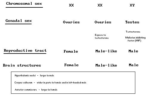 Diagram of sexual differentiation of gonadal sex, the reproductive tract, and the brain, showing how gonadal sex is determined by genetic sex, but the rest is mediated by the presence or absence of testosterone. |