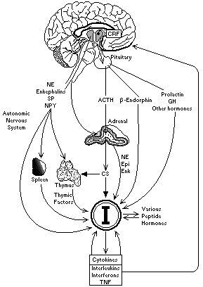 | A schematic diagram of the interactions between the brain and components of the endocrine and immune systems. The ability of the brain to alter immune system function by a variety of endocrine pathways and the autonomic nervous system is emphasized, and the effects of peptides and cytokines produced by the immune system on immune cells and the brain is indicated. Abbreviations : CRF, corticotropin-releasing factor; CS, corticosteroids; Enk, enkephalins; Epi, epinephrine; GH, growth hormone; I, immunocytes; NE, norepinephrine; NPY, neuropeptide Y; SP, substance P; TNF, tumor necrosis factor. |