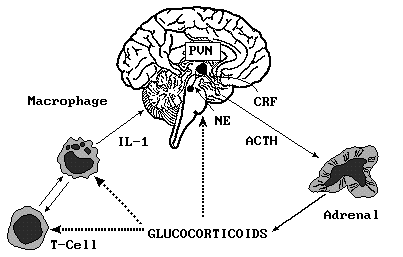 | A schematic diagram of the relationship between the brain, the HPA axis, and immune cells. Interleukin-1 (IL-1) produced by lymphocytes during the immune response activates noradrenergic (NE) projections for the brainstem to the hypothalamic paraventricular nucleus (PVN). This input activates the hypothalamic-pituitary-adrenocortical (HPA) axis, stimulating the release of corticotropin-releasing factor (CRF) in the median eminence region of the hypothalamus, which in turn stimulates the secretion of ACTH from the anterior lobe of the pituitary, which then activates the adrenal cortex to synthesize and secrete glucocorticoid hormones. The glucocorticoids in turn provide a negative feedback on cytokine production by lymphocytes. |