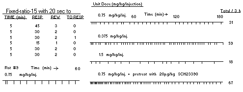 Left: Actual response record of a rat maintained on a fixed-ratio 15 schedule of cocaine self-administration at a unit dose of 0.75 mg/kg. The columns represent the total number of responses in sequential 5-min periods when the lever is active (RESP) and during the time-out periods (TO RESP) when the lever is inactive. The total number of injections received is indicated in (REW). The bottom record shows the response record over time and each mark represents the delivery of a cocaine injection. From Caine et al. (6) with permission. Right: Typical patterns of cocaine substance abuse in the rat as a function of unit dose, and following pretreatment with a dopamine-receptor antagonist. The abscissa represents time in minutes, and each mark denotes delivery of a cocaine injection. From Caine et al. (6) with permission. |