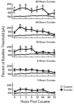 | Intracranial self-stimulation thresholds following 0, 3, 6, 12, 24, and 48 hr of cocaine self-administration at several time points postcocaine (0, 1, 3, 6, 12, 24, 48, and 72 hr). The results are expressed as percent change from baseline threshold levels. The mean ± SEM baseline threshold for the experimental group was 37.414 ± 2.516 mA and for the control group 35.853 ± 3.078 mA. The asterisks indicate statistically significant differences (p < 0.05) between control and experimental groups with Dunnett's tests after a significant group spent x hours interaction in the ANOVA. From Markou and Koob (46) with permission. |