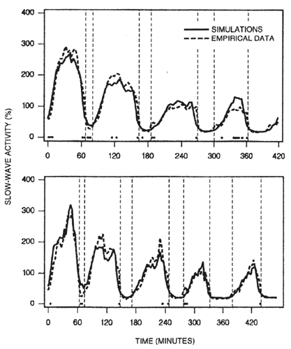 | Simulation of the time course of slow-wave activity (SWA). The curves represent mean values of empirical and simulated SWA). Top panel: baseline nights used for parameter estimation (n=16); bottom panel: independent data set which had not been used for parameter estimation (n=8). Simulations were performed on an individual basis. SWA (data and simulations) was standardized with respect to mean SWA in the first 7 h of nonREM and REM sleep. The nonREM sleep episodes were subdivided into 20 equal parts, the REM sleep episodes into five equal parts. The curves represent mean values over subjects for each part and are plotted according to the average timing of the episodes. Significant differences between data and simulations are indicated by black marks above the abscissa (p<0.05; paired t-test). (Adapted from ref. 2) |