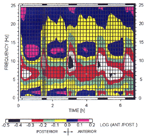 | Synopsis of the topographic EEG power gradients along the antero-posterior axis. Color coded ratio of power (log transformed) between the F3-C3 and P3-O1 derivation as a function of time and frequency. Individual nonREM sleep episodes were subdivided into 7 equal intervals, REM sleep episodes into 4 intervals, and the time between lights-off and sleep onset was represented as 1 interval. Data were aligned with respect to sleep onset (cycle 1) or with respect to the first occurrence of stage 2 after a REM sleep episode (cycles 2–4). REM sleep is indicated by horizontal black bars on top and at the bottom. Note that there is a modulation by the nonREM-REM sleep cycle as well as frequency-specific changes across and within nonREM sleep episodes. An antero-posterior shift in the SWA range is present across consecutive episodes. (Adapted from ref. 124). |
