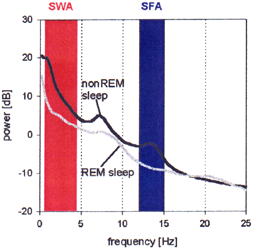 | Average EEG power spectra of nonREM (stages 1 to 4) and REM sleep (8 subjects, 1 night each). Power is plotted on a logarithmic scale (dB). Spectra were calculated for 4-s epochs (Hanning window) and five epochs were averaged and matched with the 20-s sleep scores. Only 20-s without artifacts were included. The frequency ranges of slow-wave activity (SWA, red area) and of spindle frequency activity (SFA, blue area) are marked. |