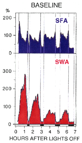 | Time course of slow-wave activity (SWA) and spindle frequency activity (SFA) during a night-time sleep episode (n=8). The nonREM sleep episodes were subdivided into 20 equal parts, the REM sleep episodes into five equal parts. The time axis represents the mean onset and offset times of the episodes. The values are expressed for each individual relative to the mean nonREM sleep level (100%). REM sleep is delimited by vertical lines and horizontal black bars above the abscissa. The colors correspond to the frequency ranges marked in Figure 5. (Adapted from ref. 24) |
