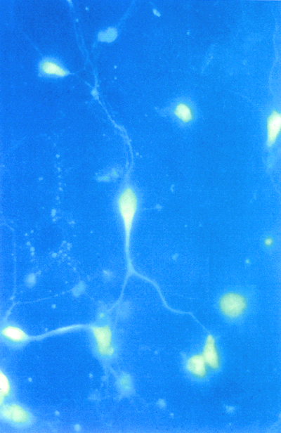 Acridine orange labeling of hippocampal neurons at 48 hours in culture. Acridine orange can be used histologically to detect RNA, which appears orange at 470 nm (DNA and proteins are pale green). Note somatic RNA, which extends distally into the apical dendrite and growth cone. Axonal labeling is not detected. |