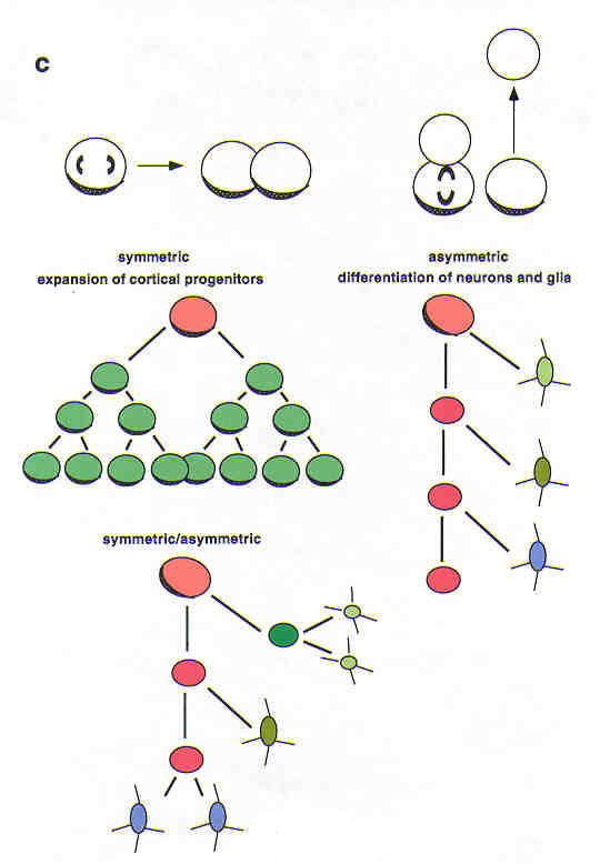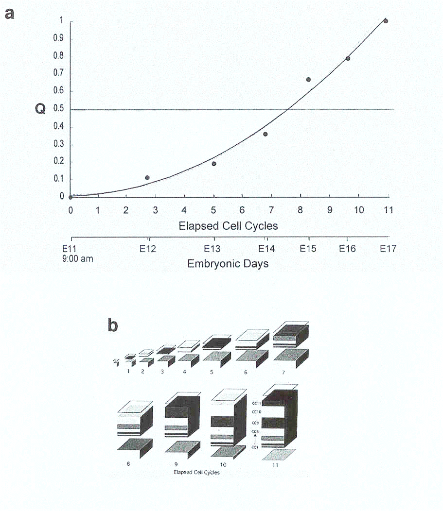 A. The progression of Q through cortical neurogenesis. Q is plotted as a function of the integer cell cycle of the neurogenetic interval in the mouse. The pseudostratified ventricular epithelium (PVE) expands before Q=0.5 (corresponding to E14, as neurons of layer IV are forming) and contracts afterwards. From Takahashi et al., (1996), reproduced with permission. B. the expansion and contraction of the PVE as calculated from the progression of Q in mouse parallels the growth of the cortical plate and the formation of neocortical layers. Data from Takahashi et al. (1996); image courtesy of Richard Nowakowski. C. (below) symmetrical divisions generating mitotic cells will exponentially increase the progenitor cell population, whereas asymmetric divisions generating a mitotic and a post-mitotic daughter will keep the progenitor population at steady-state levels. |