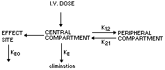Modification of the kinetic–dynamic model to incorporate an effect-site, presumed to correspond to the site of pharmacologic activity. The first-order rate constant for drug exit from the effect-site (KEO) is effectively the rate constant determining the time necessary for drug equilibration between plasma and effect-site. Kinetic–dynamic linkage models are then applied to hypothetical effect-site concentrations rather than plasma concentrations. |