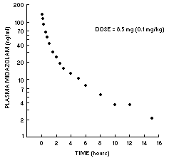Plasma midazolam concentrations following a 0.1 mg/kg intravenous dose of midazolam administered to a healthy male volunteer by continuous (zero-order) infusion over a period of 1 min. (The plasma level of 381 ng/ml just at the end of the infusion is not shown.) |