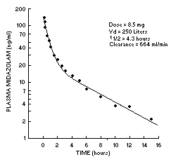 The same data points as in Fig 2. The solid line is the pharmacokinetic function, consistent with Eq. 1, which was fitted to the data points by computer using nonlinear least-squares regression. Coefficients and exponents from the fitted function were used to calculate the kinetic variables as indicated on the figure. |