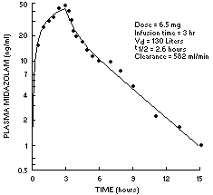 Plasma midazolam concentrations in a healthy volunteer who received a 0.1 mg/kg intravenous dose by constant-rate (zero-order) infusion over a period of 3 hr. The solid lines are the pharmacokinetic functions determined by simultaneous fitting of Eqs. 2 and 3 to data points during and after the infusion, respectively. Pharmacokinetic variables based on the fitted functions are indicated on the figure. |