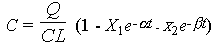 In this equation, C is the plasma drug concentration at time t after rapid intravenous injection. A and B are intercept terms having units of concentration, and a and b are exponents having units of reciprocal time. The exponents a and b are related to, but are not equal to, the intrinsic rate constants associated with the two-compartment model (Fig. 1).