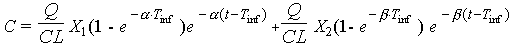 In these equations, a and b again are exponents having units of reciprocal time, Tinf is the duration of the infusion, Q is the infusion rate, and CL is the drug's metabolic clearance. The coefficients X1 and X2 are related to a, b, and KE. Equation 2, which represents an ascending function, is applicable during the time that the infusion is ongoing (0 ≤ t ≤ Tinf). The infusion ends at t = Tinf, at which time Eq. 3 becomes applicable (t ≥ Tinf); this equation represents a descending function. Taken together, Eqs. 2 and 3 are continuous at all points in time, but at t = Tinf, the change point, the collective function does not have a first derivative.